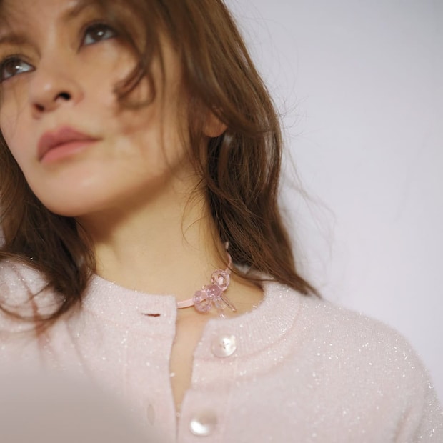 本気のチョーカーもいいけれど、今回着用したようなガラス製などの遊びのあるモノがよりおしゃれ度を上げてくれます。今年らしいピンクを選ぶならやや青みのあるベビーピンクがオススメ。