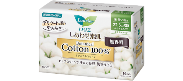 ピュアコットンの極上の柔らかさ。ロリエ しあわせ素肌Botanical Cotton100%多い昼用22.5cm 羽つき16個 無香[ 医薬部外品]¥440※参考価格(花王)