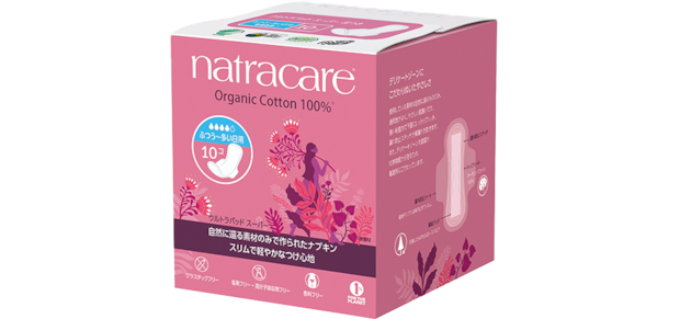 世界初のオーガニック&ナチュラルケア用品メーカーの化学物質フリーなアイテム。ナトラケア ウルトラパッド スーパー ふつう・多い日用〈羽つき〉 10個入り ¥858(ビープル)