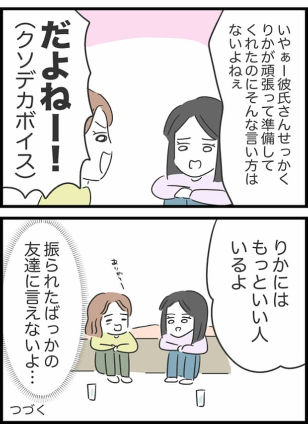 りかの話を静かに聞いていたすみれ。彼氏の言っていることはすべて正論で思わず彼氏に同情してしまいます。しかし、りかにそんなことを言うわけにもいかず、友達としてどうりかに声をかければいいのかを必死で考えることに。フラれて傷ついているときですし、変なことを言って地雷を踏みたくもないですよね。