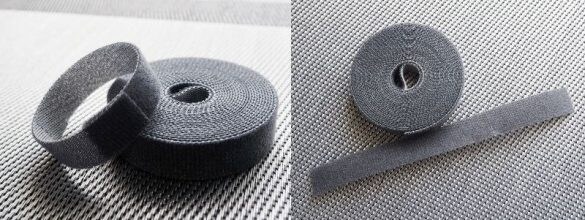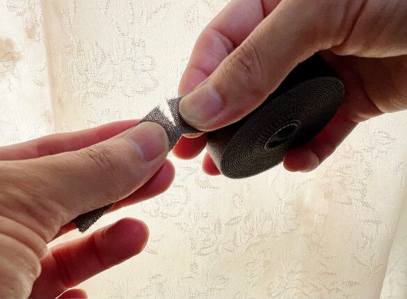 「ミシン目入り結束テープ」の使い方は、2ステップ。必要な長さにカットしたテープを束ねたケーブルにクルッと巻きつけ、留めるだけ。