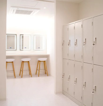 スタジオだけでなく、女性専用ならではの設備も充実。予定の前後に通えるよう、ロッカールームおよびパウダールームが完備されており、