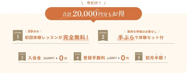 50分の初回体験レッスンが完全無料や、手ぶらで体験セット(ウェアなどすべてレンタル可能)に加え、体験当日に入会の人に限り入会金10,000円無料、登録手数料1,000円無料、初月半額といった特典も付いてくる。