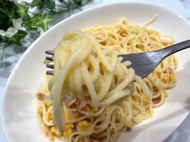 湯煎でソースを温め、茹でたパスタに絡めて完成させてみました。商品名に”たっぷりコーンとベーコン”と書かれている通り、具材がたくさん入っていて、食べる前からボリューム感に驚かされます!