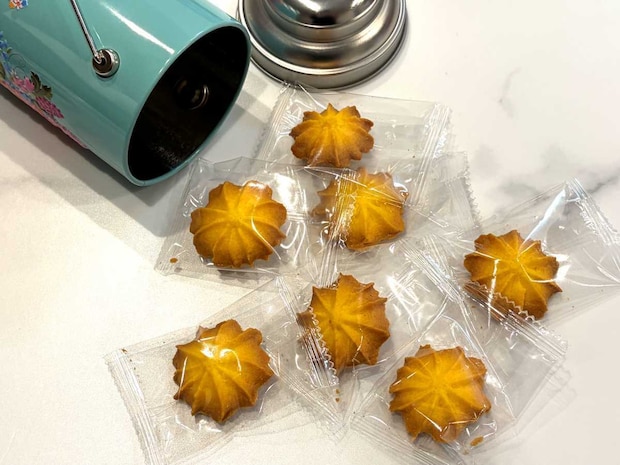 中のクッキーはおしゃれな花の形をしていました。缶とクッキーの見た目の可愛さも魅力的なお菓子ですね!