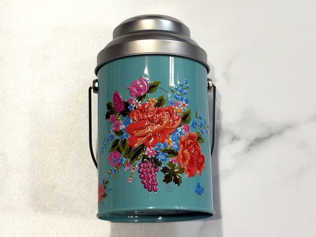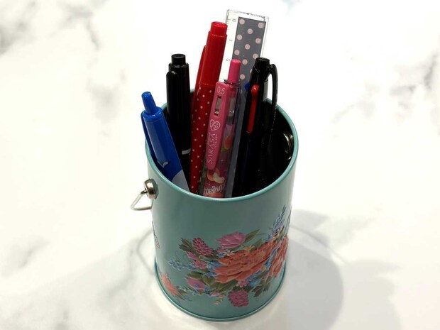 食べ終わった後のクッキー缶には、ペンや定規など文房具を入れてみました。花柄と淡いブルーのカラーがおしゃれなデザインで、置くだけでも部屋の雰囲気が変わりますよ♪