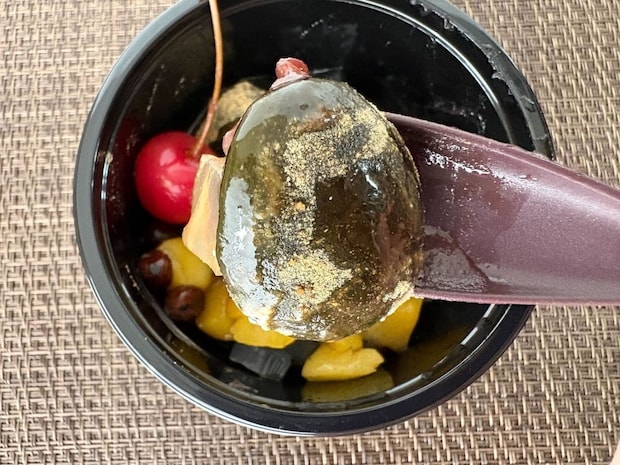 実際の味わいは、寒天のしっかりとした歯ごたえと、宇治抹茶わらび餅のもちもちとした食感のコントラストが絶妙です。