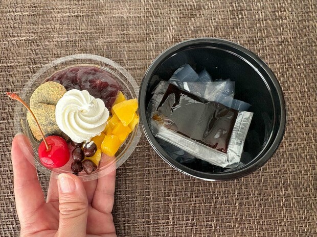 中身が見える透明な2段容器のパッケージで、下段には寒天、上段のカップにはホイップクリーム、宇治抹茶わらび餅、マンゴーシロップ漬け、自家炊き粒あん、塩豆がたっぷり!
