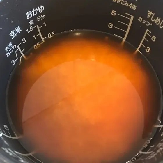 2.洗ったお米に調味料を加え、2合のラインまでだしを入れます。