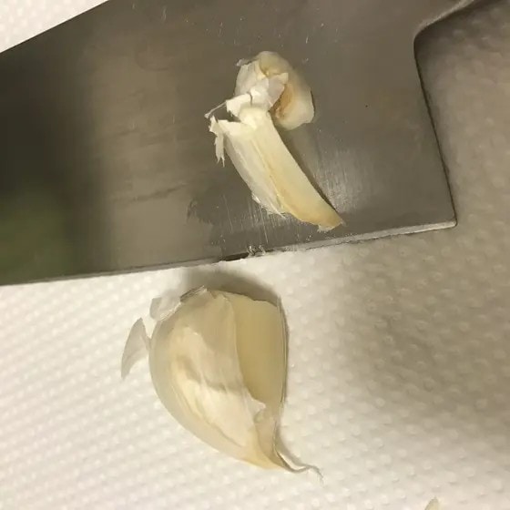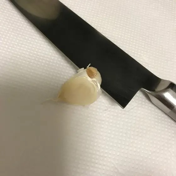 1.いつもなら切り落とすにんにくのお尻の部分に包丁を入れます。