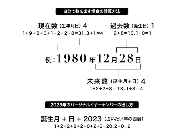 生年月日や姓名を数に置き換え、特定の計算方法によって算出したパーソナルな数字からその人を分析するもの。基本的には、生年月日を使って導き出す「現在数」「過去数」「未来数」の3つを軸に占います。大人は「現在数」を使って本記事を読み進めてください。