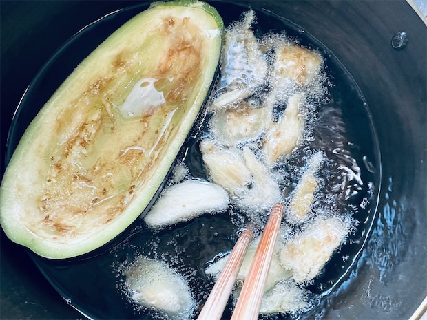 1. なすは縦半分に切り、皮に沿って包丁の先を入れてからスプーンで果肉をくり抜き、サラダ油で素揚げにする。