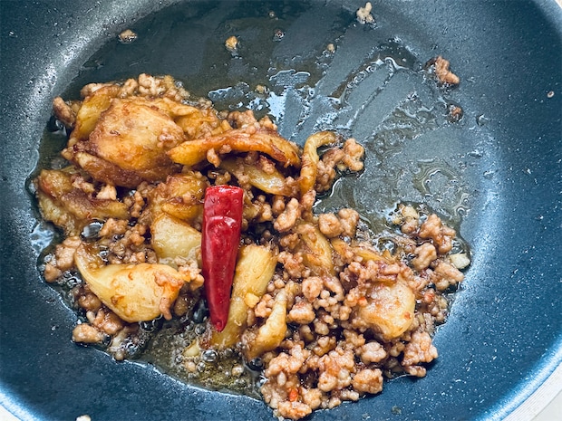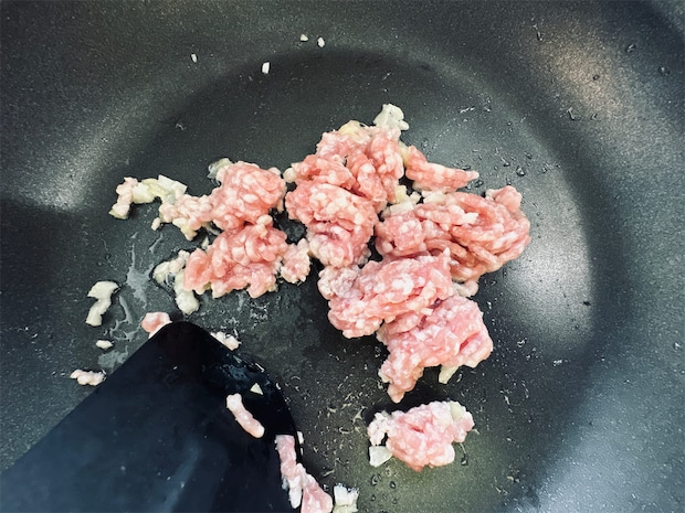 2. フライパンにサラダ油を熱し、ひき肉と[A]を入れ弱火で炒める。