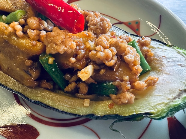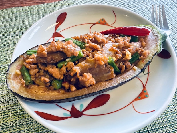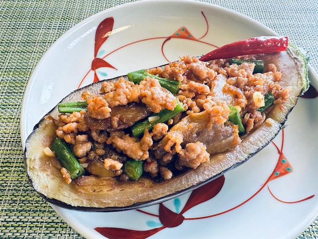 今回は大きな米なすだったので、麻婆なすがすべて皮の器に収まりましたが、こぼれるように盛り付けるのもアリですね。
