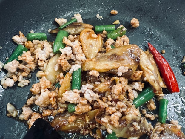 元レシピに記載がなかったので、初めはさやいんげんをカットせずに炒めてから、麻婆なすに添えてみましたがこれは明らかに違う気が…(汗)。そこで、食べやすく切ってから全体に混ぜ込んでみました。