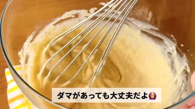 - 温めた牛乳を①に入れて混ぜ、さらにホットケーキミックスを入れて混ぜる