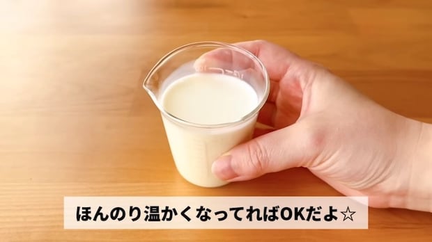①のボウルに、下準備で温めておいた牛乳を加えます。