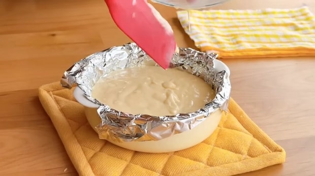 下準備であらかじめアルミホイルを敷いておいたグラタン皿に、②で混ぜた生地を流し入れます。