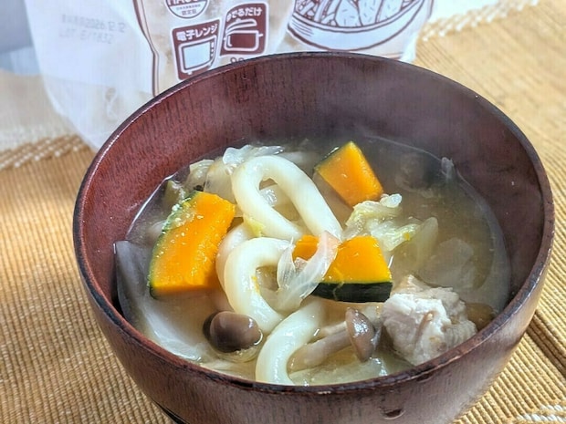 味噌ベースのつゆに、鶏肉、かぼちゃ、白菜、きのこなどの野菜をたっぷり入れて10分ほど煮込んでも、麺の弾力がしっかり残っていてモチモチ!