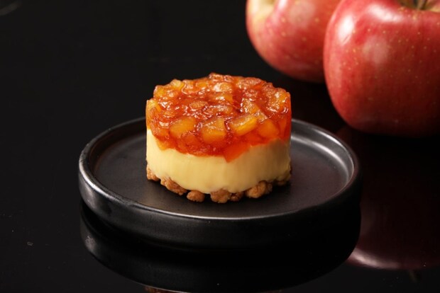 ザクザクとした食感のクランブル生地の上に甘さ控えめのカスタードをのせ、食べやすいサイズにカットしたりんごとカラメルソースをトッピングした。りんごの酸味と食感が楽しめる。