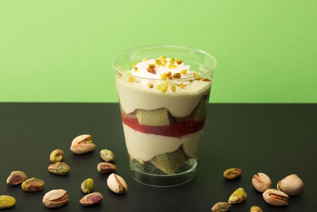 ピスタチオ風味のシフォンケーキ、濃厚なピスタチオクリーム、ベリーソースを重ね、その上にホイップクリームをのせた。食感のアクセントとして、砕いたピスタチオをトッピングしている。