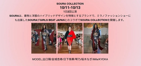 さらに、ミラノで開催されたショーにも出展し、一分で着れる着物という驚きの提案と高いファッション性を併せ持つ、昨今注目度の高いハイブリッド着物ブランド「SOURA」のファッションショー・SOURA COLLECTIONも開催される。