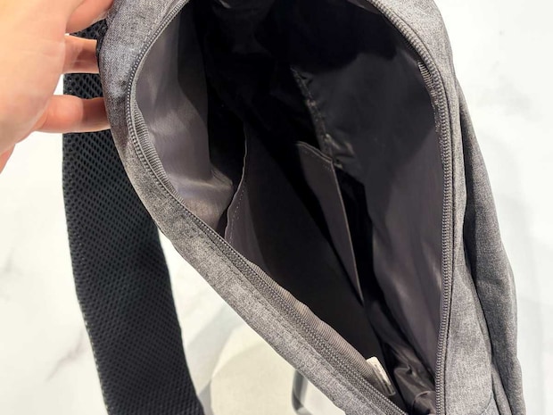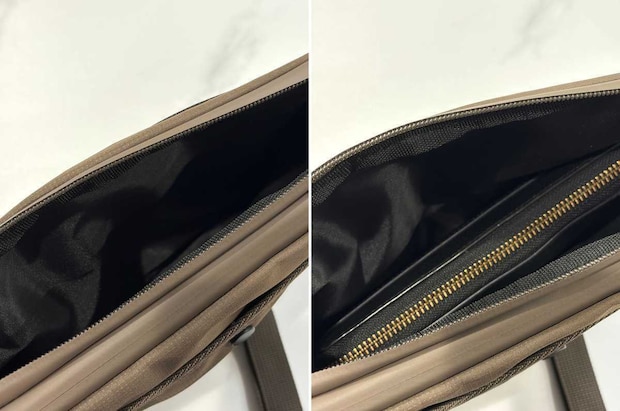 側面のファスナーからバッグを開けると、内部にはメインの収納スペースとサイドポケットが用意されていました。