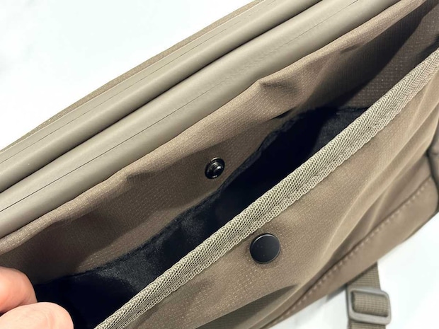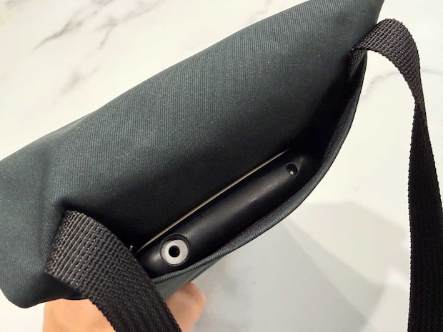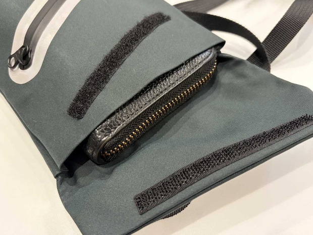 上部のメインポケットは、マジックテープで閉じる設計となっています。試しに長財布を入れてみたところ、ギリギリ入る容量。