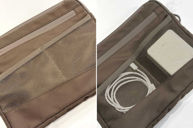 側面のメッシュの収納スペースには、モバイルバッテリーと充電ケーブルを入れてみました。