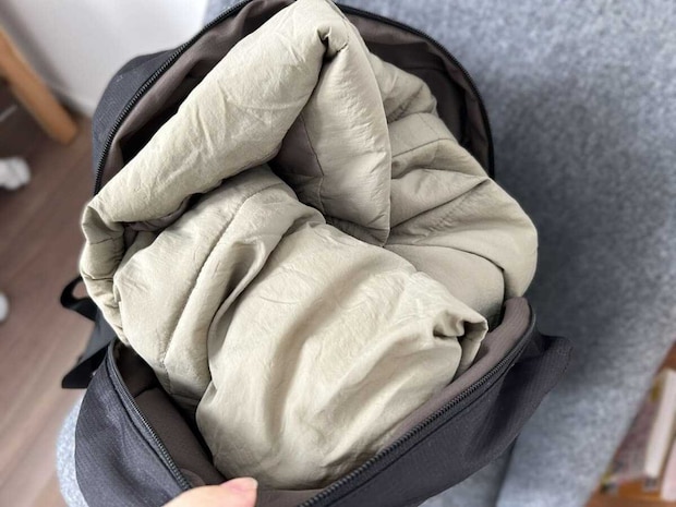 先ほどのファイルなどの荷物を収納したまま、試しに薄手のダウンジャケットも入れてみました。ファスナーもしっかり閉まり無理なく収納できたので、容量面も大満足です♪