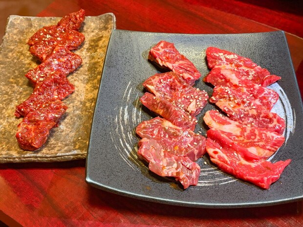 続いて、右が上カルビ¥1,188、真ん中がハラミ¥1,067、左が旨唐ハラミ¥1,100(税込)