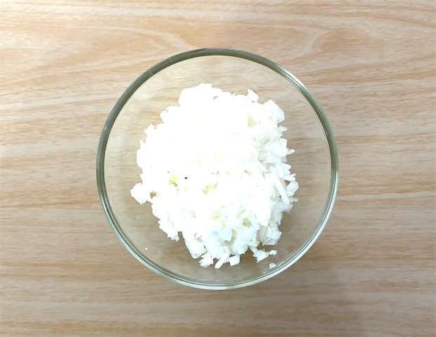1. 玉ねぎは皮を剥いて粗みじん切りにする。キャベツは芯を外して粗みじん切りにして、芯は細かく刻む。