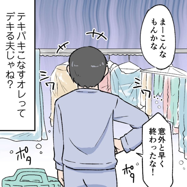 「まーこんなもんかな・・・意外と早く終わったな!」洗濯物の干し方とかよく分からないけど、とりあえずハンガーにかけておけば、天気も良いし乾くでしょ。妻が出かけてる間にテキパキ家事をこなす俺って、なかなかにできる夫。