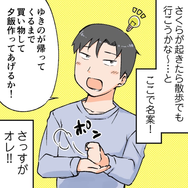 育児にもすっかり慣れ、立派なイクメンになってきた俺。オムツだって替えられるし、ご飯だって毎回あげていて、我ながらいいパパだと思います。そんなある日の週末、妻ゆきのが1人で出かけることに。夕方までさくらと2人きりで、初めての留守番をすることになりました。ゆきのは不安そうだけど、ひと通りのことはできるし、留守番くらいどうってことありません。