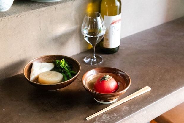 カウンター、テーブル席に加えて、外には立ち飲み席も。旬野菜のおでんに自然派ワインをあわせて