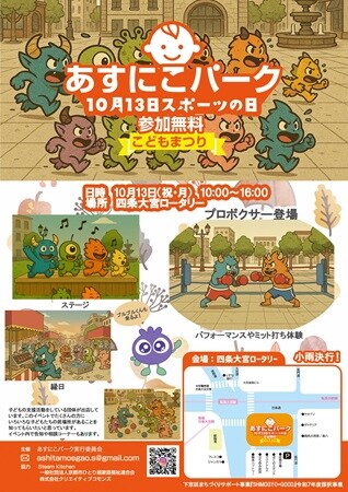 こどもまつり「あすにこパーク2025秋」の開催日時は、10月13日(月・祝)の10時から16時まで。入場無料で、小雨決行とのこと。会場の四条大宮ロータリーは阪急電車「大宮駅」、嵐電「四条大宮駅」、市バス「四条大宮」のどこからでも徒歩1分でアクセスできる。