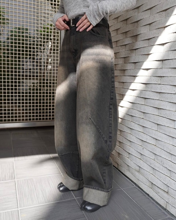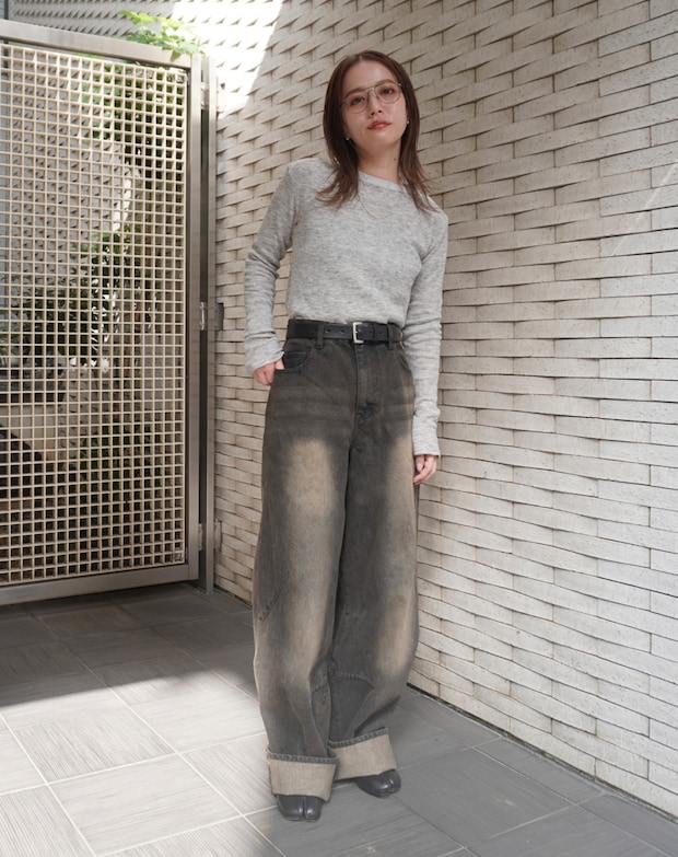 「加工やシルエットが目をひくデニムを主役に。トップスはコンパクトなサイズ感のもの(首元を自由に調整可能な珍しいデザインなんです)を合わせ、低身長なのでヒールのタビブーツでバランスを取ることを意識しました」