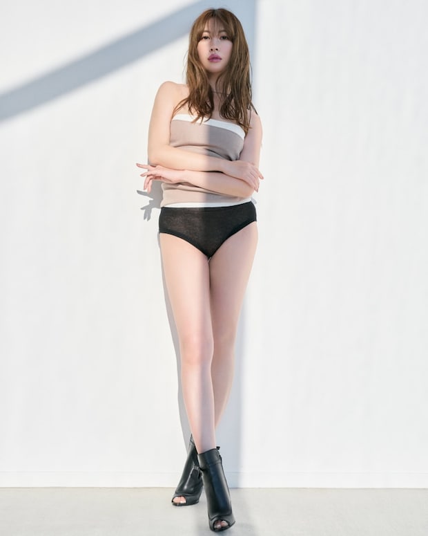 ボディスーツ¥35,200(プランクプロジェクト/プランクプロジェクト 青山店)、モチーフ付きバングル¥88,000、リング¥69,300(共にヒロタカ/ヒロタカ 表参道ヒルズ)、バングル¥43,000(ヒロタカ/ビームス 六本木ヒルズ)、ショーツはスタイリスト私物