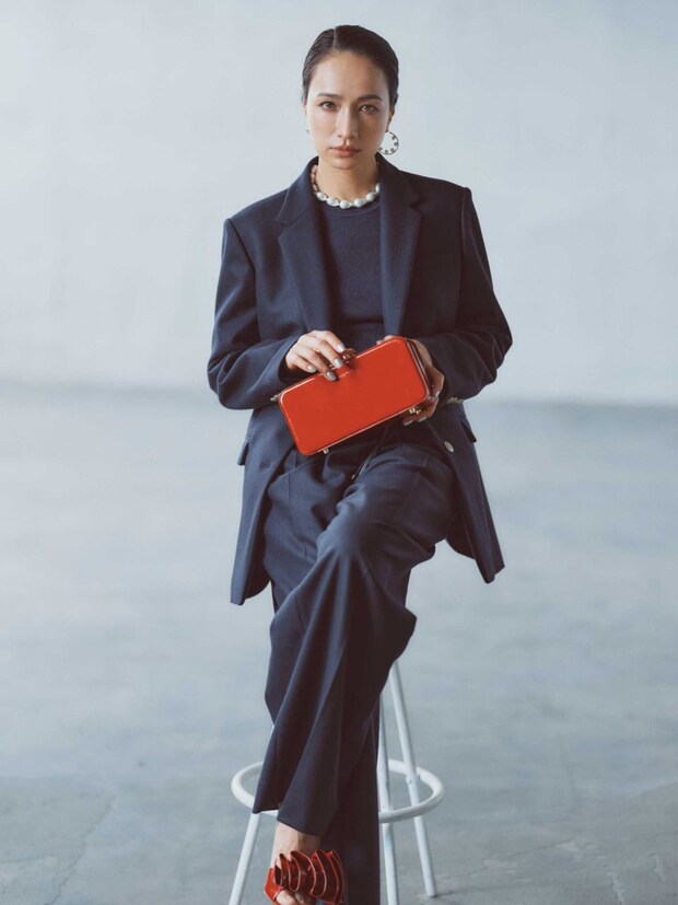 この佐田真由美さん、激シブ! ネイビーのパンツスーツに、赤いバッグやシューズをポイントにする着こなし、今すぐマネしたい!