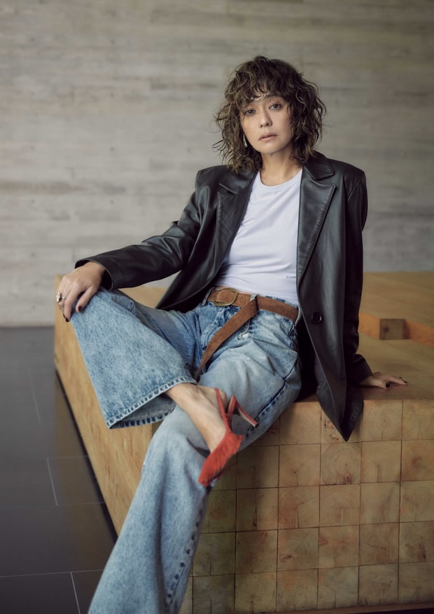 クセの強いレザージャケットは余計なことをせず白Tとオーセンティックなデニムくらいがいいですよ、と加藤かすみさん。さすが「シンプルだけど洒落ている」スタイリストさんです。あ、竹下玲奈さん、パーマヘアもお似合いですね。