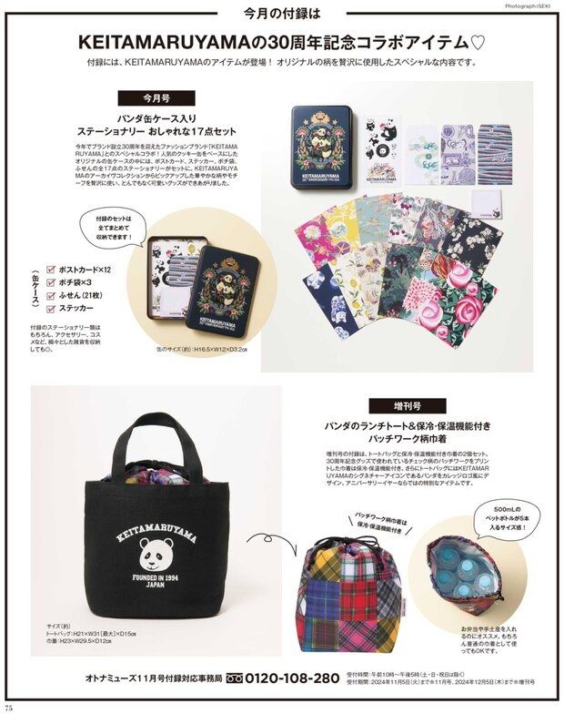 そしてセブン-イレブンやセブンネットショッピングなどでご購入いただける増刊号の付録は『KEITAMARUYAMA 30周年記念♡ パンダのランチトート&保冷・保温機能付き巾着』。チェック柄のパッチワークプリントの巾着は保冷・保温機能つきでブラックのトートからチラっと見えるとまた、なんておしゃれなんでしょう。お弁当を入れてドヤ顔で持ち歩いていただいてもいいですが、こんな可愛いパンダ柄はメインバッグ扱いにしたい気もして、心が揺れます。どうぞ手に入れて心を揺らしてください。