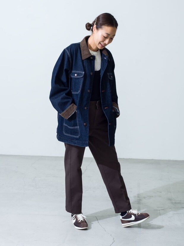 「50年代を意識したデニムのオーバーサイズカバーオールを主役に持ってきました。コーデュロイの襟もポイント! バランスを取るためにも細いシルエットのチノパンを合わせてキチンと感をオン。パンツとスニーカーとも旬なブラウンに統一して、ヌケのあるキレイめな秋っぽさを目指しました」