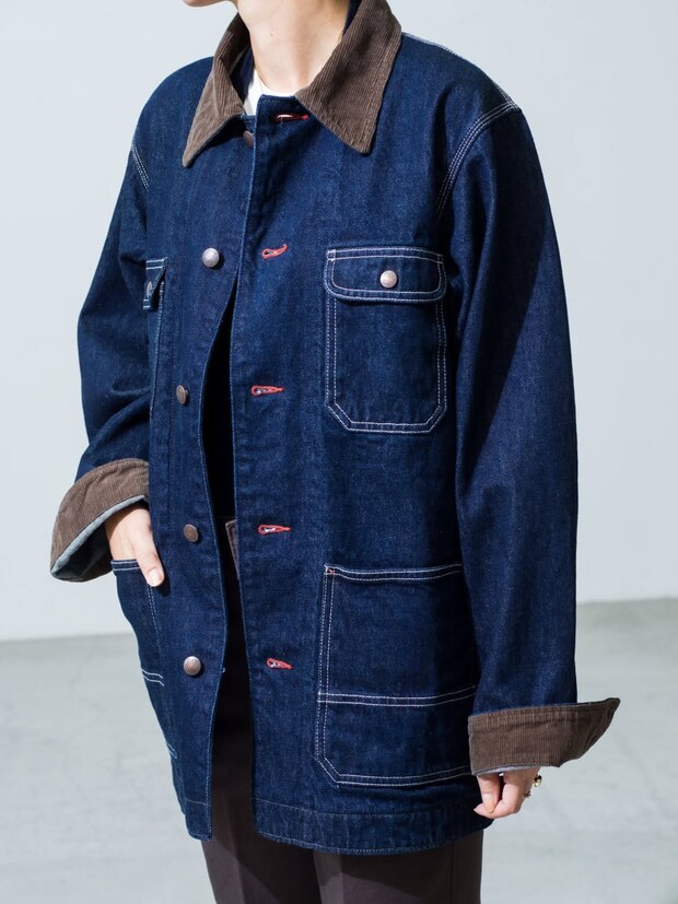 「PAYDAYのカバーオールジャケットは50年代の古着をベースにデニムとコーデュロイの秋冬らしいコンビネーションで別注しました。裏地付きでゆったりとしたサイズ感は、ニットの上にも重ねられ、軽いアウターとしても重宝します」別注ジャケット¥36,300(ペイデイ/RHC ロンハーマン)