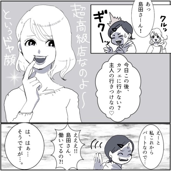 主人公の子どもが通う幼稚園には、セレブで有名なママ・花岡さんがいる。彼女の夫は大手企業の役員らしく、何かとそのことを周りに自慢したり、お金持ちアピールをしたりと、花岡さんのマウントをみんな煙たがっていた。特に、スーパーでパートをしている主人公への嫌味は一段とひどく、会うたびにバカにされていた。そんなある日、なんと突然花岡さんの人生が一変する出来事が起きることに!?