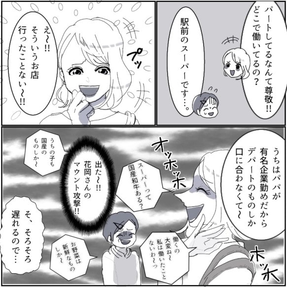 主人公の子どもが通う幼稚園には、セレブで有名なママ・花岡さんがいる。彼女の夫は大手企業の役員らしく、何かとそのことを周りに自慢したり、お金持ちアピールをしたりと、花岡さんのマウントをみんな煙たがっていた。
