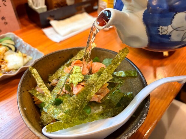〆にお茶漬けを注文。自分で急須を注ぐスタイル。なんだか楽しいですね!ほろほろの鮭がのっており、鮭の脂と旨味が出汁に染み出ていました!贅沢な〆をいただけました…!