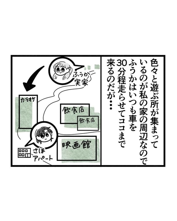 2人が住んでいる場所は車社会。遊ぶところまでは、ふうかさんが車を30分ほど走らせて来るのが多いそうです。しかしいつも遅刻してくるふうかさん。さほさんは「次は遅刻しないでね」と念押しで伝えますが、遅刻せずきてくれるのでしょうか。