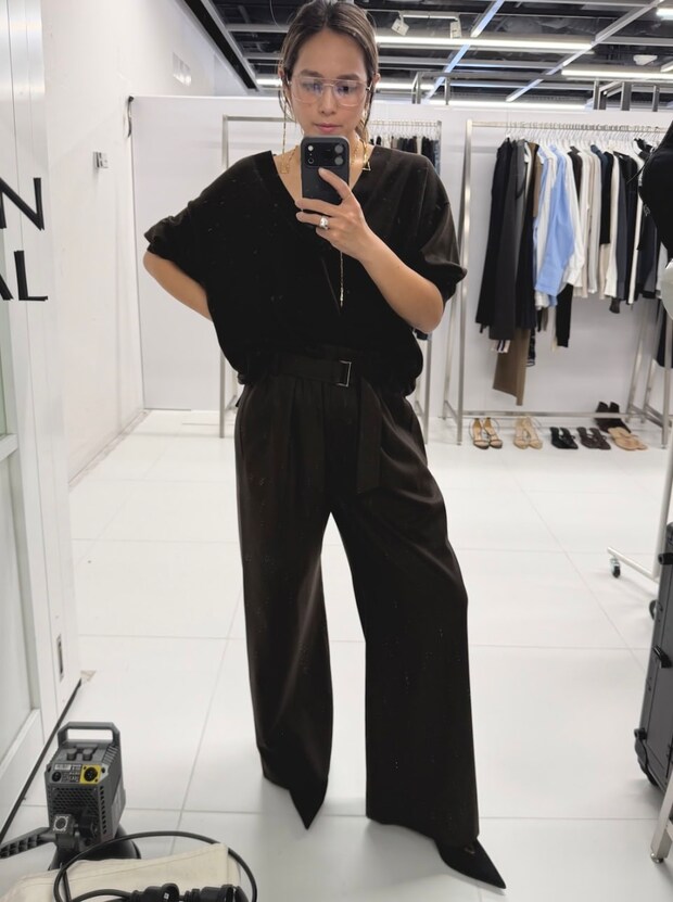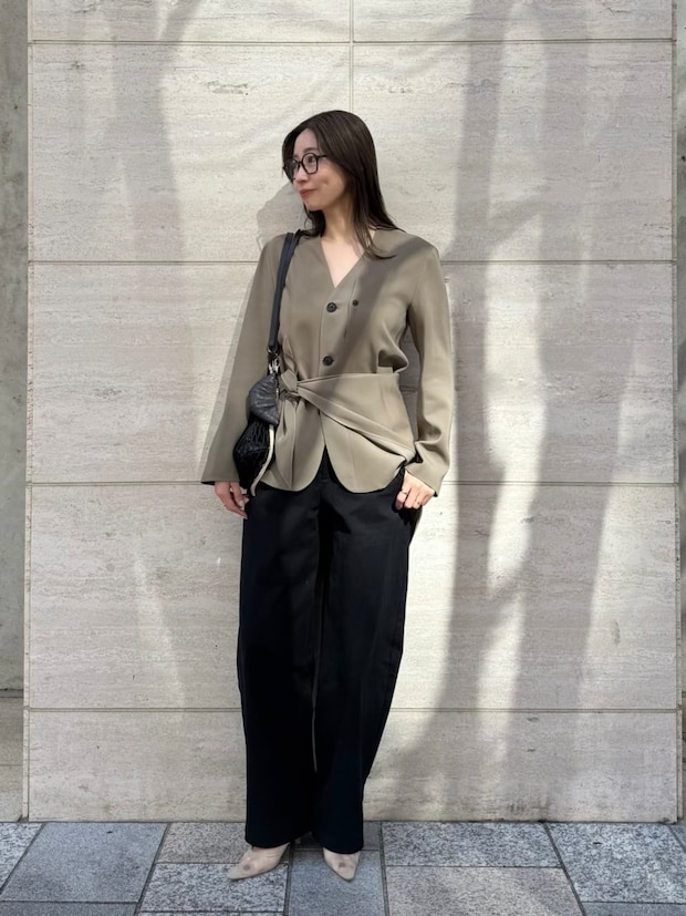 上品見えするジャケット&パンツスタイルを、黒縁眼鏡でほどよく着くずすと親近感がアップ。腰に巻いたスカートなど小物がアクセントになっているので、ジュエリーは控えめが正解。