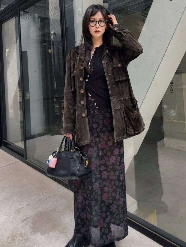 シアーな花柄にレザージャケットを合わせたモードなスタイリングを、ほどよくラフに落とし込む黒縁眼鏡。サングラスほど決まり過ぎず、コーデにアクセントを与えてくれます。
