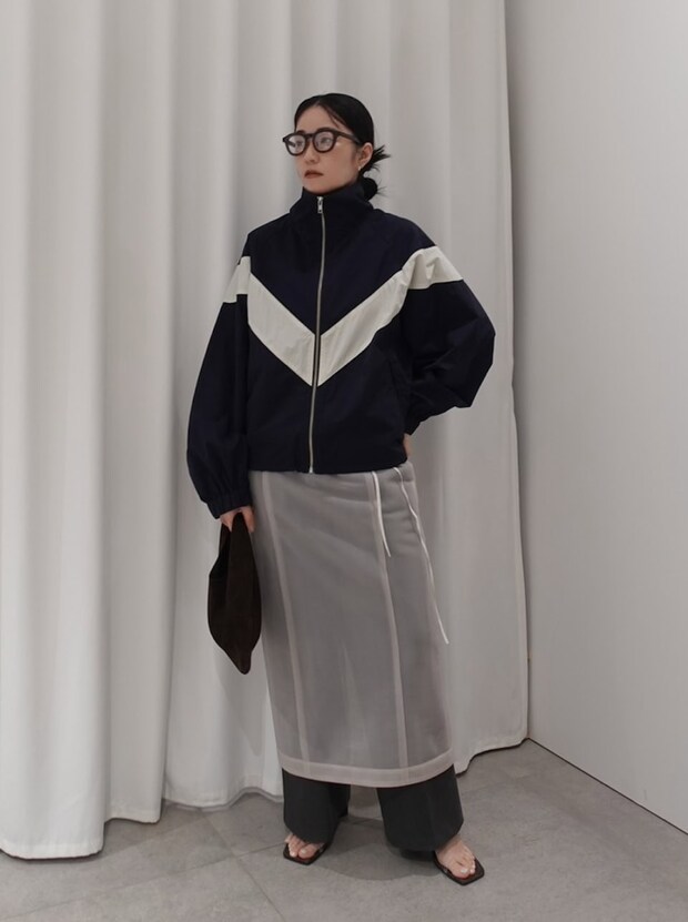 テイストミックスのレイヤードコーデをまとめるポイントは、スポーティなブルゾンをよりファッショナブルに落とし込んでくれる黒縁眼鏡の存在。眼鏡のおかげで全体のバランスが整います。